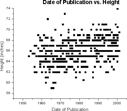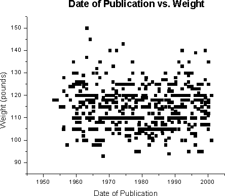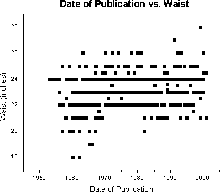 One unexpected finding was the complete absence of a significant change (p = 0.9510) in the weight of the Playmates over the history of the publication. This can be explained by the highly statistically significant (p < 0.0001) contradicting influences of an increase in height and waist line with declining bust and hip measurements. In effect they grew taller and less shapely over the years.The relatively low predictive value of the model (R2 = 0.4807) was likely due to several factors.